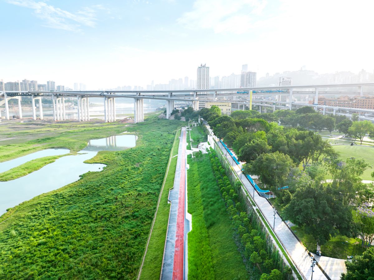 采用了独特的水工挡墙与景观绿化一体化建造技术,打造4.23km175标高滨水步道,实现防洪安全、生态修复、景观美化、公共游憩的多元融合。珊瑚坝及周边滩涂区域构建重自然、轻介入的生态修复体系。可在冬季淹没 120 天后,30 天内自然复绿。