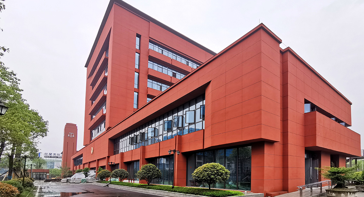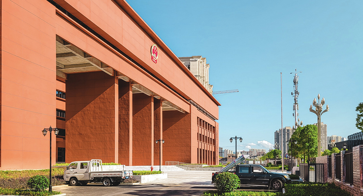 规划设计体现了顺山就势保留更多的原生植物和水体,建筑沿街界面体现法院建筑的庄重、秩序空间和精神堡垒,建筑与保留山体则是采用退让+融合多种手法,形成有机整体。外立面大胆采用学院红,深深透露出建筑本身的文化韵味和红色基因,凸显自身独有的标志性。