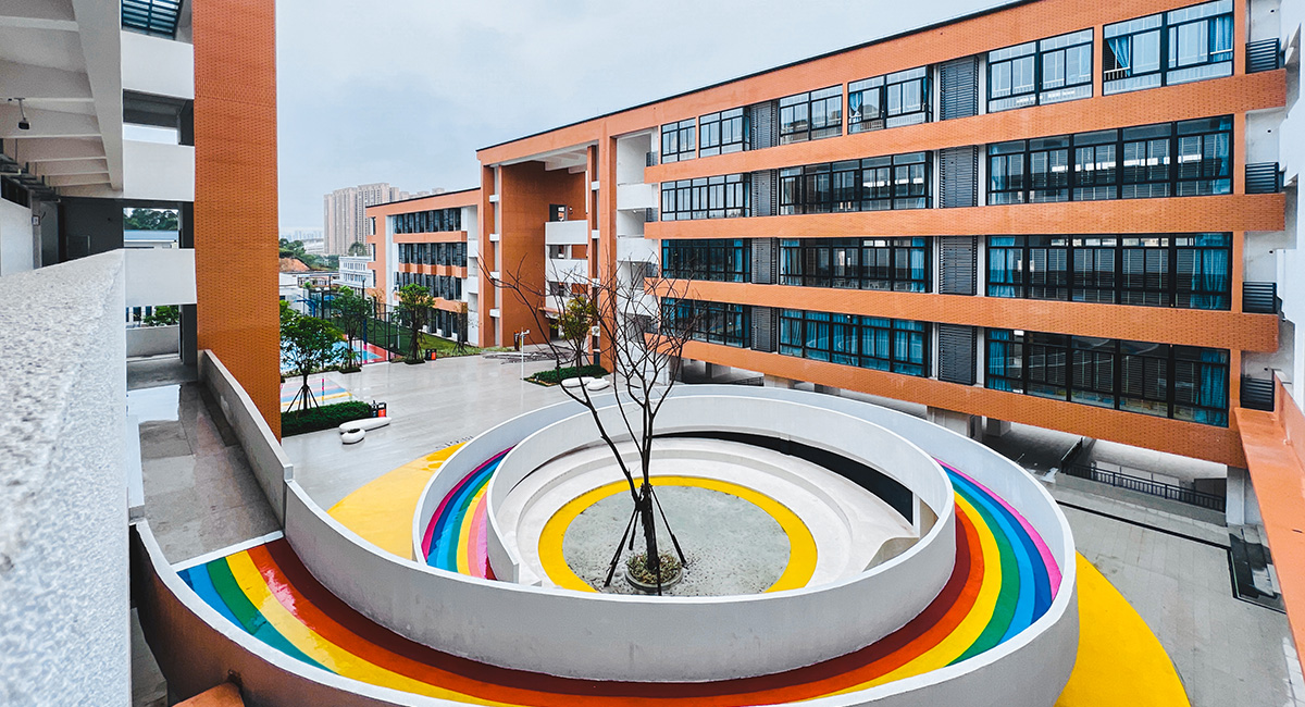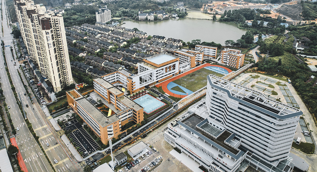 本项目是在2019年通过方案竞赛赢得的设计项目。本项目为九年一贯制学校,属于五矿?哈施塔特地产项目的配套学校,设计规模为45个班,可容纳学生2100人,总建筑面积35700㎡,项目已于2022年秋投入使用。