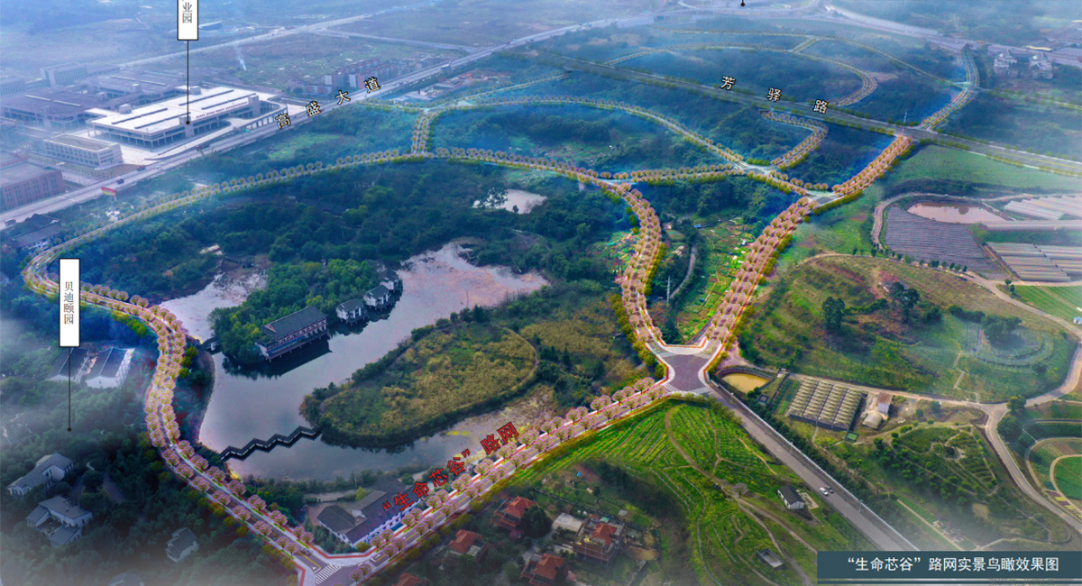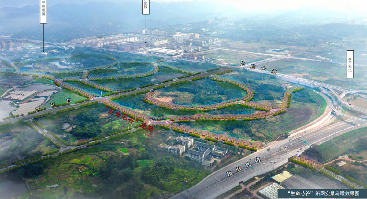 本项目位于重庆市高新区,主要包括“三片路网+两条道路”,共32条道路,共约43.5公里。涉及道路、桥梁、隧道、雨污水、综合管网(综合管廊)、照明、绿化、交通工程、BIM、智慧交通、海绵城市等专业。本项目涉及高新区直管园多个区域,位于“一心聚核”、“轴带共生”等多个片区。项目中金凤湖路网部分道路、真武路位于环科学公园创新生态圈边缘,是“一心聚核”的重要补充道路。项目中金凤湖路网、“生命芯谷”路网、巴福组团路网、广宏路均位于“一轴一带”范围,本项目通过与其他道路交通转换完善“一轴一带”的交通服务。