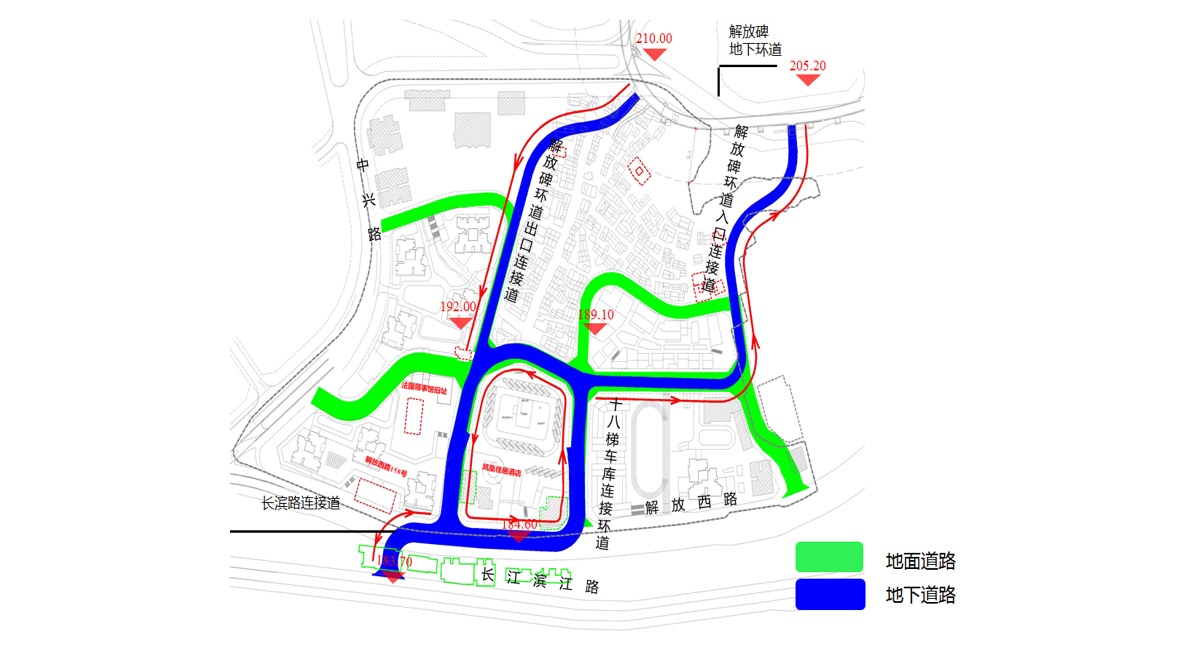 新建四条隧道形成一环三连接形式。地下环道为单洞单向隧道,长度为348.277m。隧道净宽9.97m,净高8.21m,净空面积62㎡。隧道全线采用暗挖,最小埋深仅5m左右。