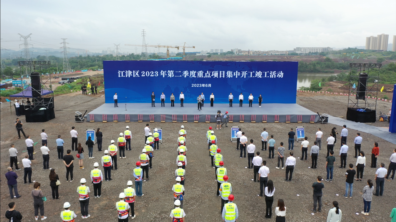 江津区委书记李应兰致辞并宣布重点项目集中开工竣工。区政协主席杨利,区领导刘晟、李祖明、杨玉书、段祥出席。区委副书记秦敏主持,区委常委、副区长李勇介绍集中开工竣工重点项目基本情况。中冶赛迪集团党委副书记、总经理肖鹏作为团结湖数字经济产业园项目建设方代表发言。